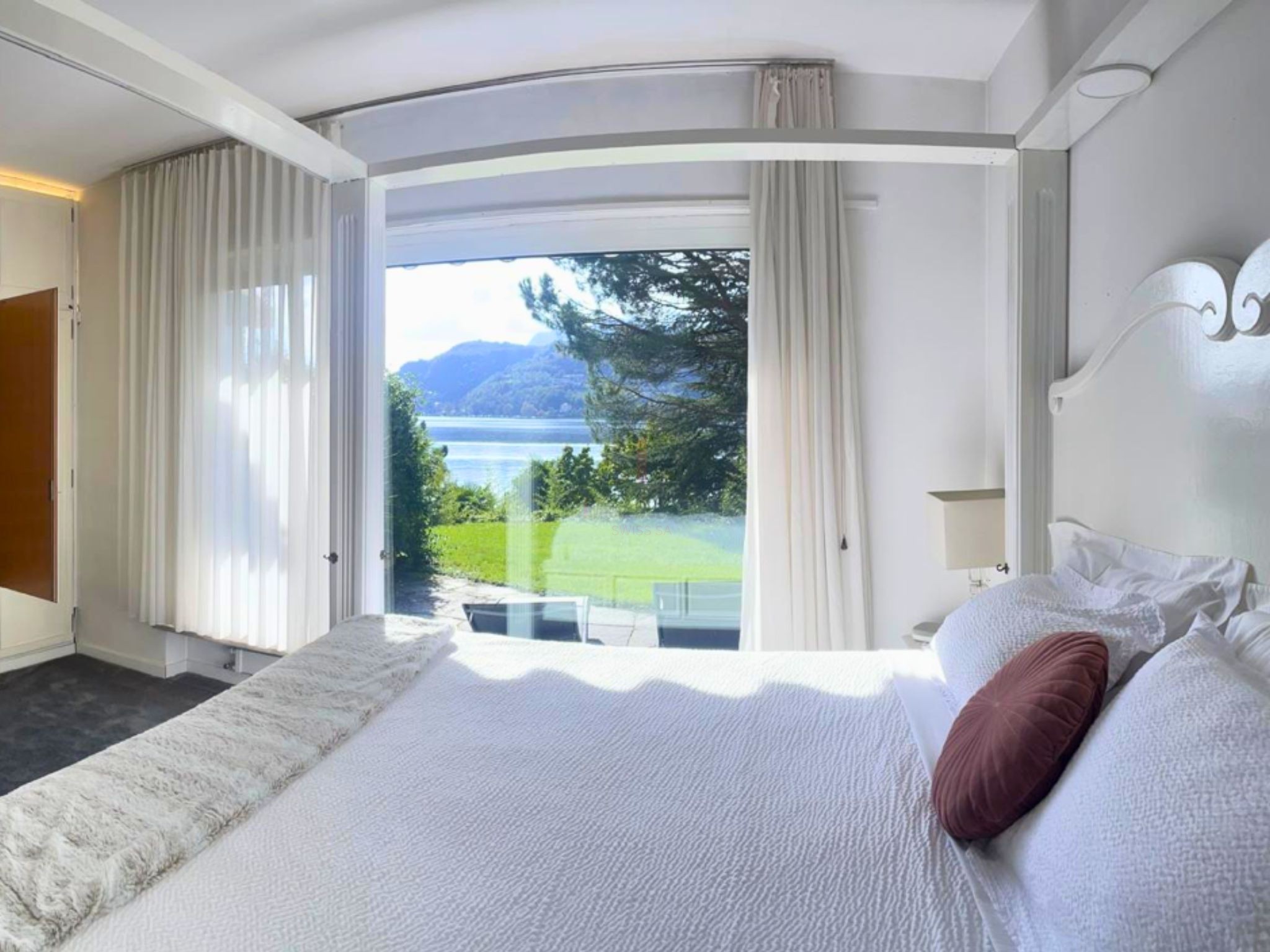 Die erste Wohnung verfügt über einen offenen Wohnbereich mit ausgestatteter Küche, zwei Schlafzimmer mit herrlichem Blick auf den See und ein fensterloses Badezimmer mit Dusche. Die zweite Wohnung bietet ein geräumiges und einladendes Panoramawohnzimmer mit Kamin und ausgestatteter Küche, ein großzügiges Hauptschlafzimmer, das seinesgleichen sucht, sowie ein fensterloses Badezimmer mit Badewanne, Dusche und Sauna. Die dritte Wohneinheit bietet eine große, sonnige Terrasse, einen geräumigen und komfortablen Wohnbereich, ein Schlafzimmer und einen Raum, der als Hobbyraum genutzt werden kann, sowie ein Badezimmer mit Badewanne und Regen-Dusche. Zum Angebot gehören der wunderbare Garten, eine ideale Gästedependance, eine Doppelgarage und ein Parkplatz, der Platz für bis zu sieben Fahrzeuge bietet.