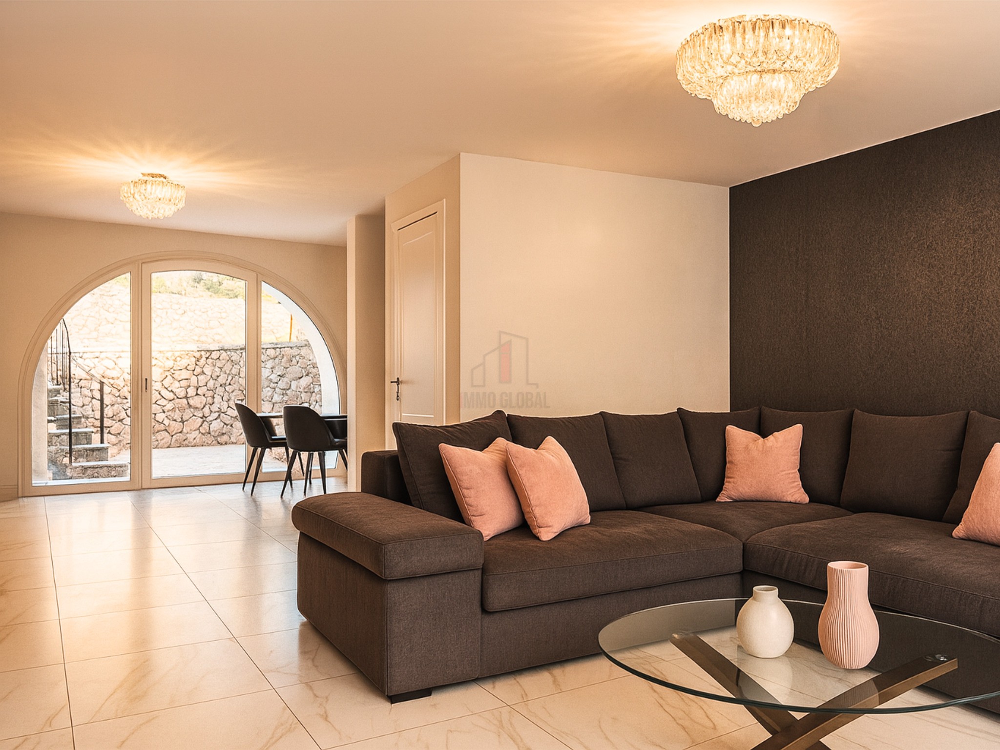 Das Anwesen erstreckt sich über drei Ebenen, davon eine im Untergeschoss, und ist wie folgt aufgeteilt: Das Erdgeschoss besteht aus einem großen, offenen Raum für den Wohnbereich, der eine ausgestattete Küche, einen Essbereich mit Zugang zur Terrasse und ein geräumiges Wohnzimmer umfasst, das auf die überdachte Veranda und den üppigen Garten blickt. Im ersten Stock befinden sich zwei großzügige Schlafzimmer, von denen das Hauptschlafzimmer Zugang zum überdachten Balkon mit Panoramablick hat. Beide sind durch ein Fensterbad mit Dusche verbunden. Das Untergeschoss umfasst den Technik-/Waschraum, einen als Keller genutzten Bunker, den Stauraum unter der Treppe und einen gemütlichen Hobbyraum.