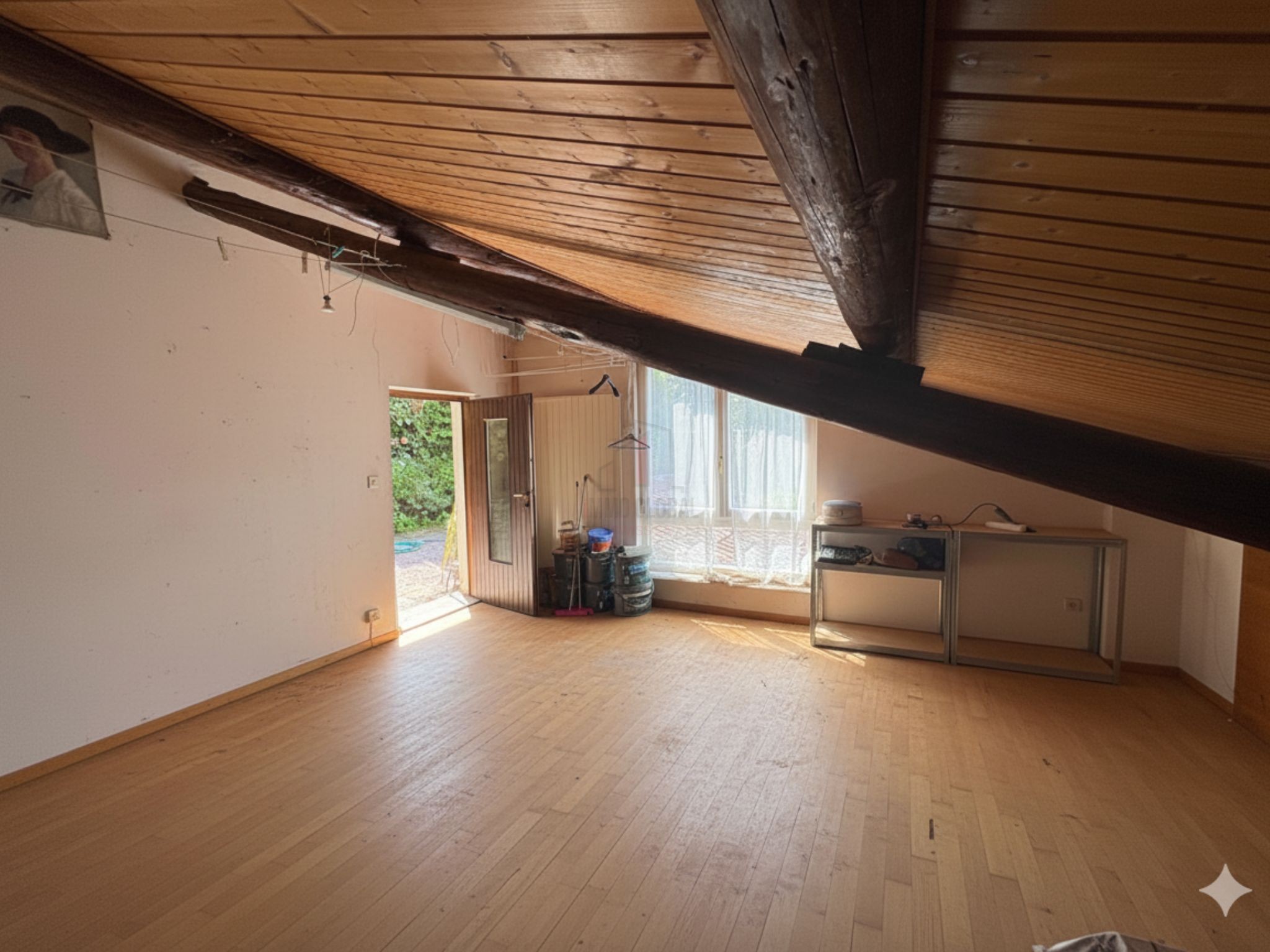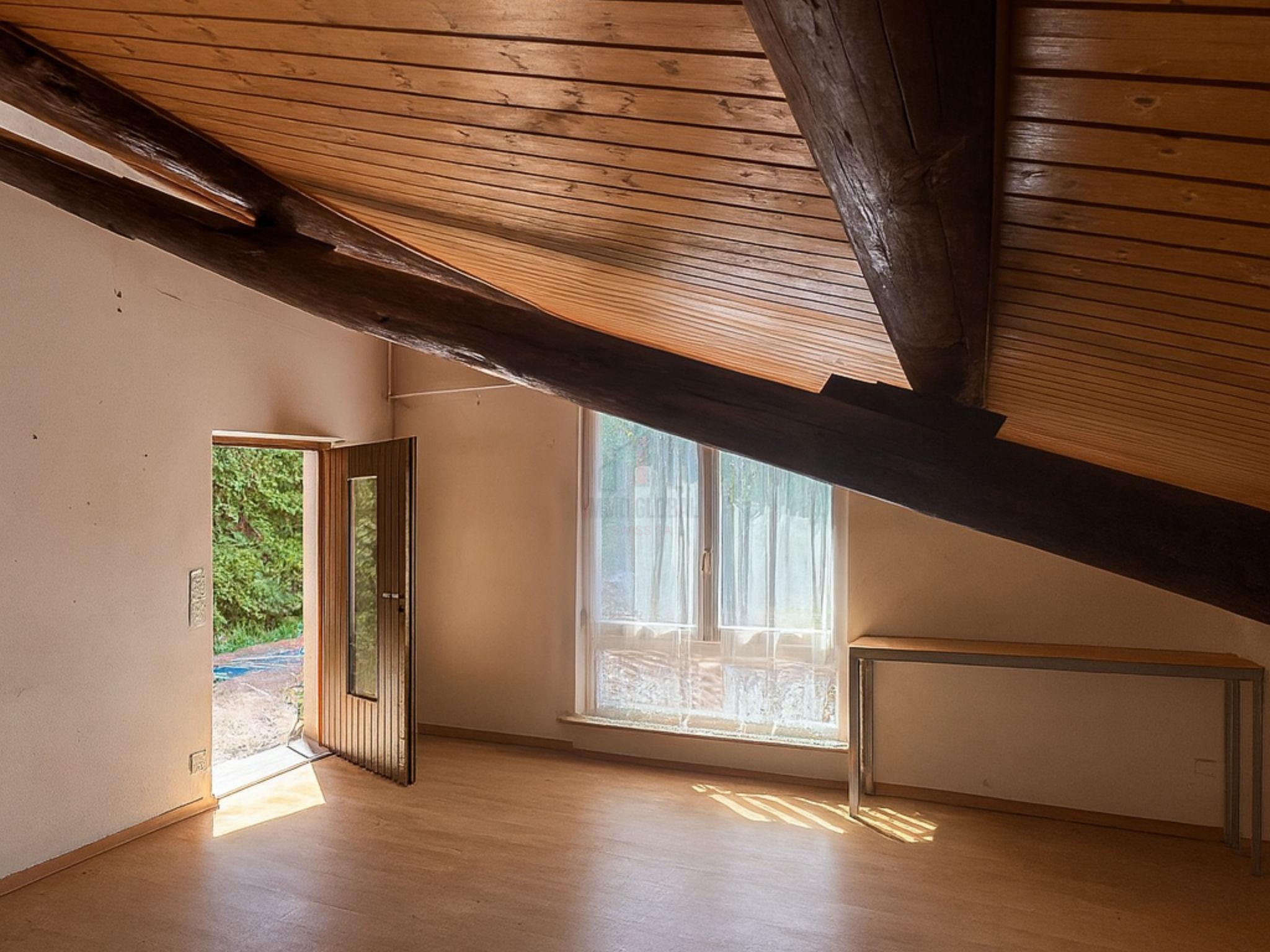 Im Obergeschoss befindet sich der Schlafbereich, bestehend aus einem Hauptschlafzimmer mit Balkon und teilweisem Seeblick, zwei gut dimensionierten Kinderzimmern und einem Badezimmer mit Badewanne. Vom Garten aus gelangt man zum Dachboden, ein vielseitiger Raum, der als Büro, Hobbybereich oder kleines unabhängiges Studio mit Seeblick genutzt werden kann.