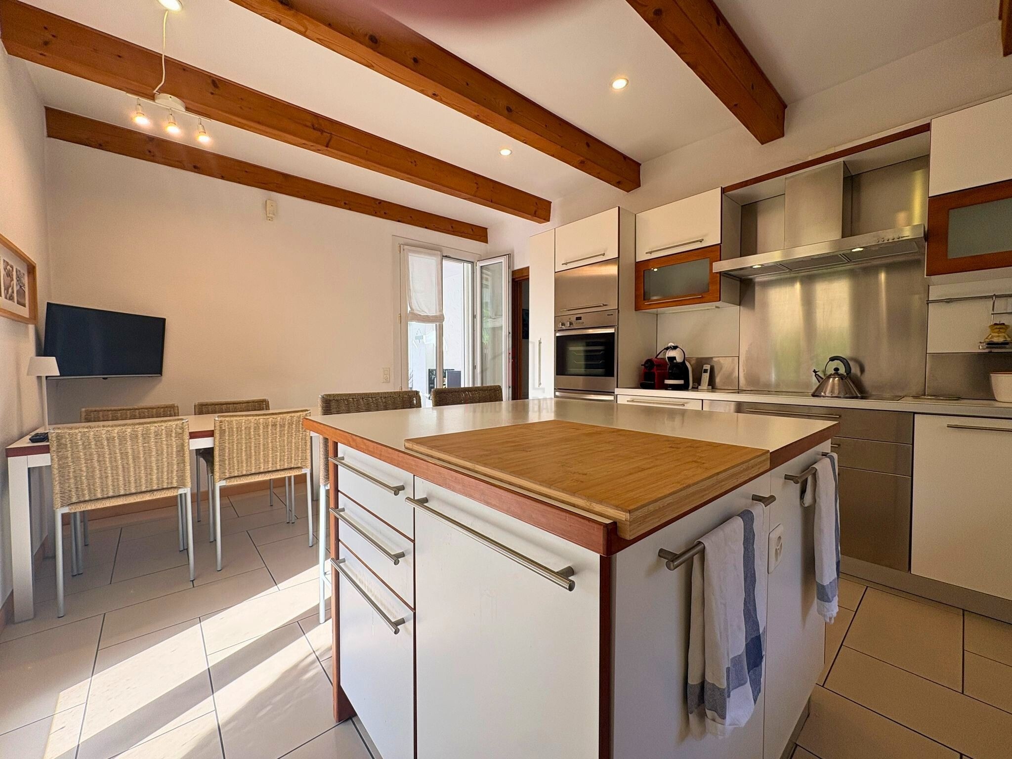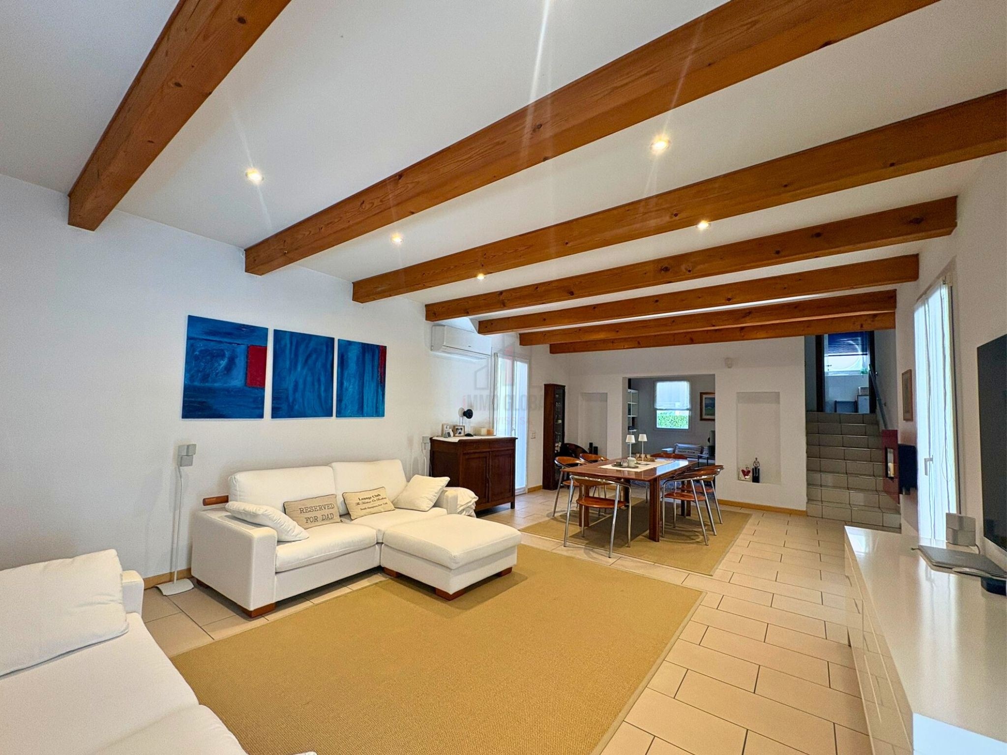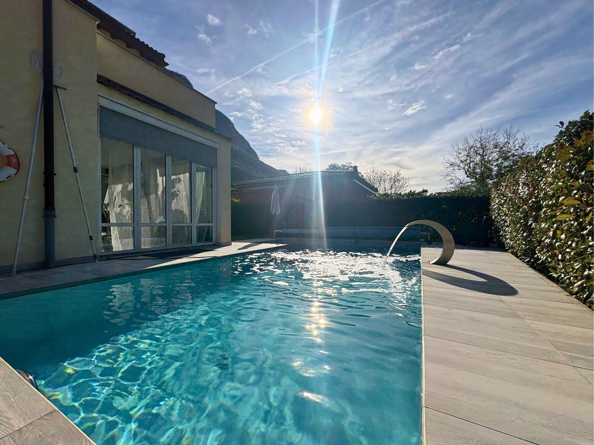 From the first glance, the house welcomes you with its elegant architecture and refined finishes, which give the spaces a warm, modern, and deeply inviting atmosphere. The living area invites you to enjoy the spaces and savor every moment of comfort. The large and bright double living room is the true heart of the house: the fireplace, wooden beams, and large windows create an intimate and refined atmosphere, where it's easy to imagine quiet or convivial evenings with family and friends. The eat-in kitchen, practical and welcoming, accompanies daily life with a balance between functionality and elegance. A convenient study allows for peaceful work or immersion in music. The veranda, bathed in natural light, overlooks the garden and prepares the eye for the beauty of the outdoor space. Here, the garden becomes a true oasis of relaxation, enriched by a heated pool with a cervical waterfall and counter-current swimming, inviting you to enjoy every season with ease and wellness.