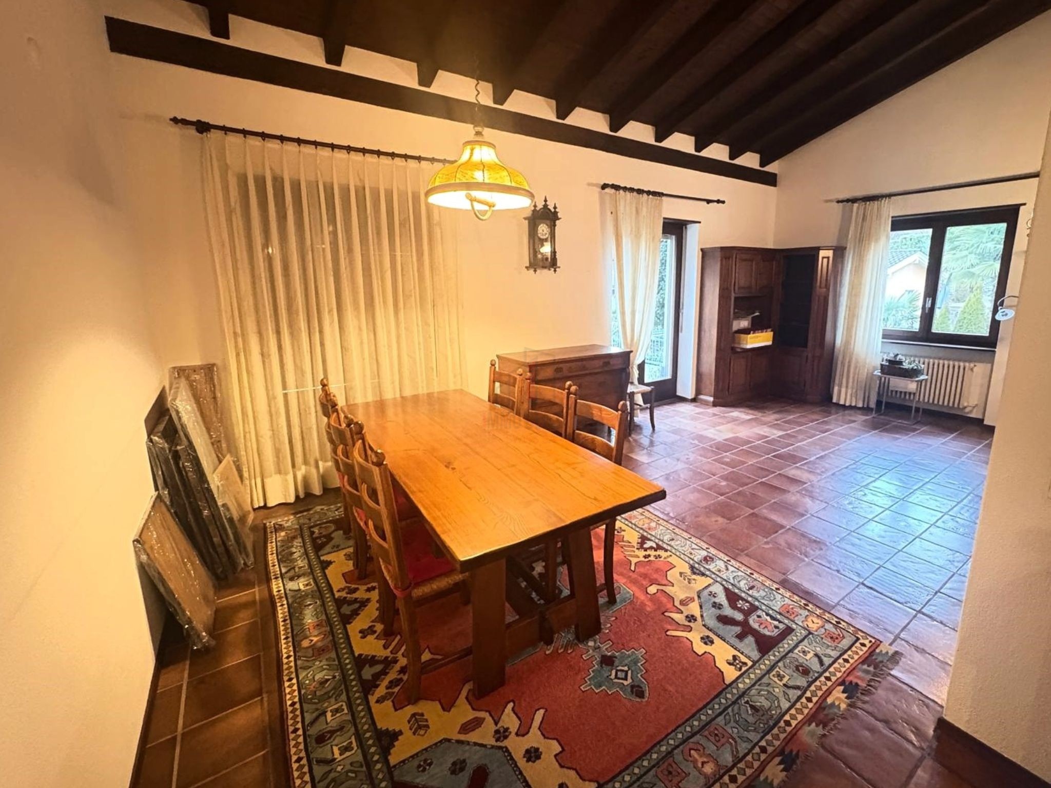 Beim Eingang begrüßt Sie ein praktischer Einbauschrank, während das Wohnzimmer mit Kamin und doppelt hoher, sichtbarer Balkendecke eine warme und einladende Atmosphäre bietet. Die separate und bewohnbare Küche ist perfekt für Hobbyköche, ausgestattet mit Holzschränken und hochwertigen Geräten. Beide Räume bieten direkten Zugang zu einer Veranda, die auf ein üppiges Grün blickt, ideal für sommerliche Abendessen im Freien oder Momente der Entspannung.